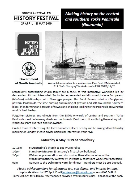I learnt so much researching and coordinating this workshop at Stansbury Institute as part of South Australia’s History Festival 2019. First setting the scene with a slideshow of images and Narungga words compiled by the Narungga Aboriginal Progress Association. Then I presented about Europeans’ (bindirra) relationships with Narungga people, the Point Pearce mission (Burgiyana) and Narungga culture today. My collaborator Richard Maerschel covered pastoral, mining, … Continue reading Making history on the central and southern Yorke Peninsula (Guuranda), 5 May 2019